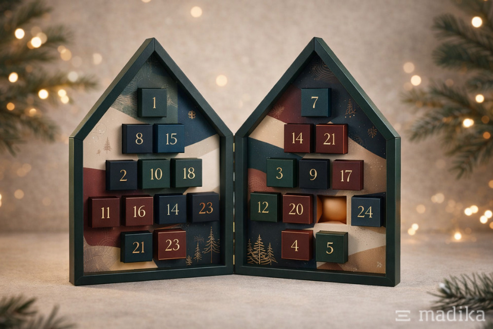 kalender für Pflegeprodukte oder Kosmetika. Aber auch Genussprodukte wie Pralinen verkürzen in diesem Haus Adventskalender die Wartezeit bis Weihnachten. Bedruckt und veredelt bestellen Sie den Adventskalender ab 1 Stück.